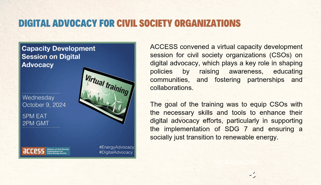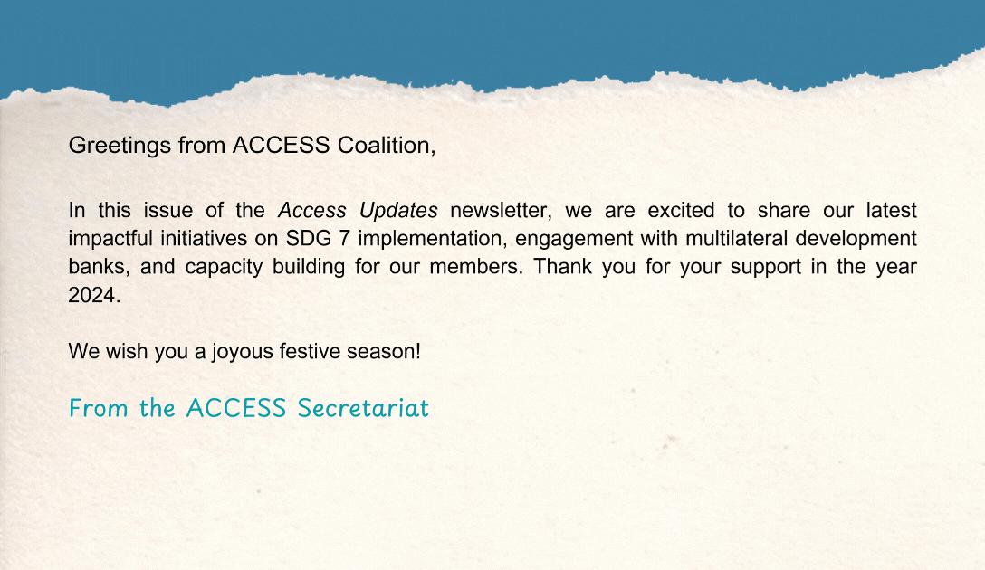In this issue of the Access Updates newsletter, we are excited to share our latest impactful initiatives on SDG 7 implementation, engagement with multilateral development banks, and capacity building for our members. Thank you for your support in the year 2024.We wish you a joyous festive season!